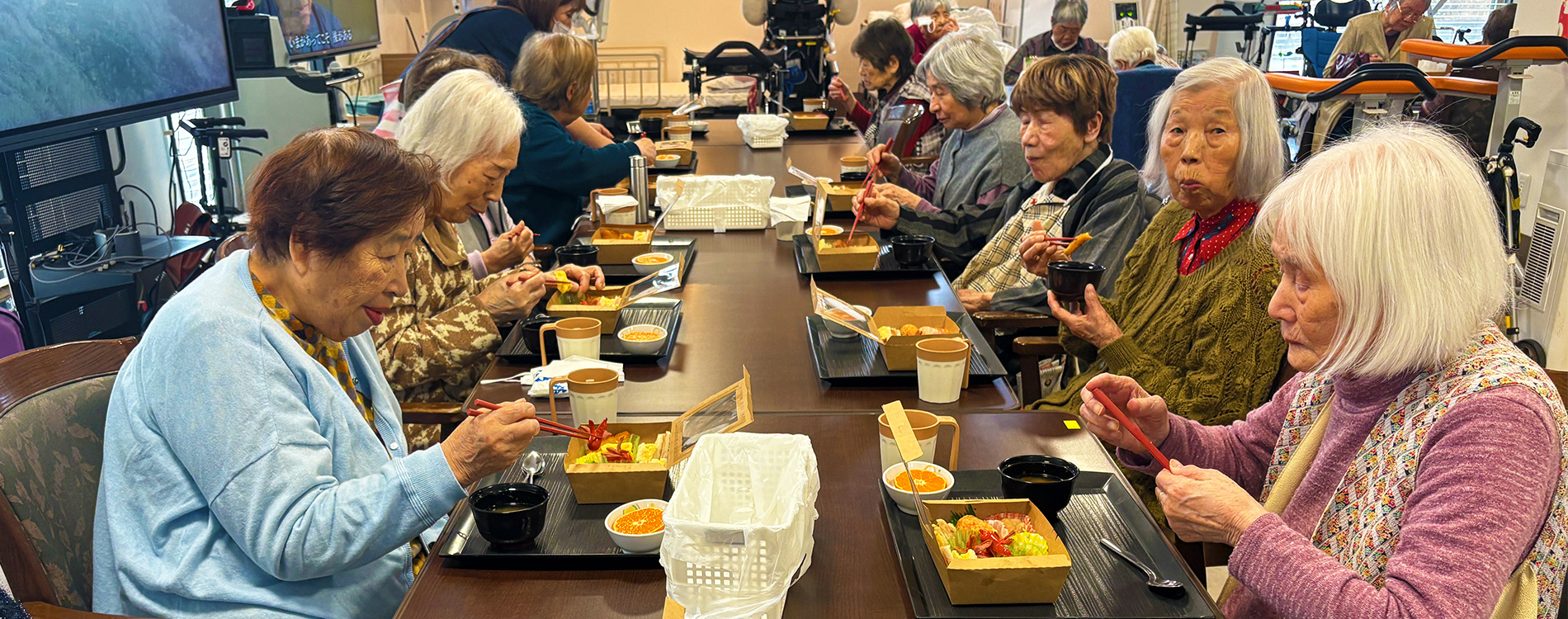 食事のお時間はとても楽しみな時間です。タンパク質量、カルシウム量に特に気を配り、病態(肝臓病・減塩食・腎臓病・糖尿病他)嚥下(飲み込み)フレイルにも個々に対応し提供しております。